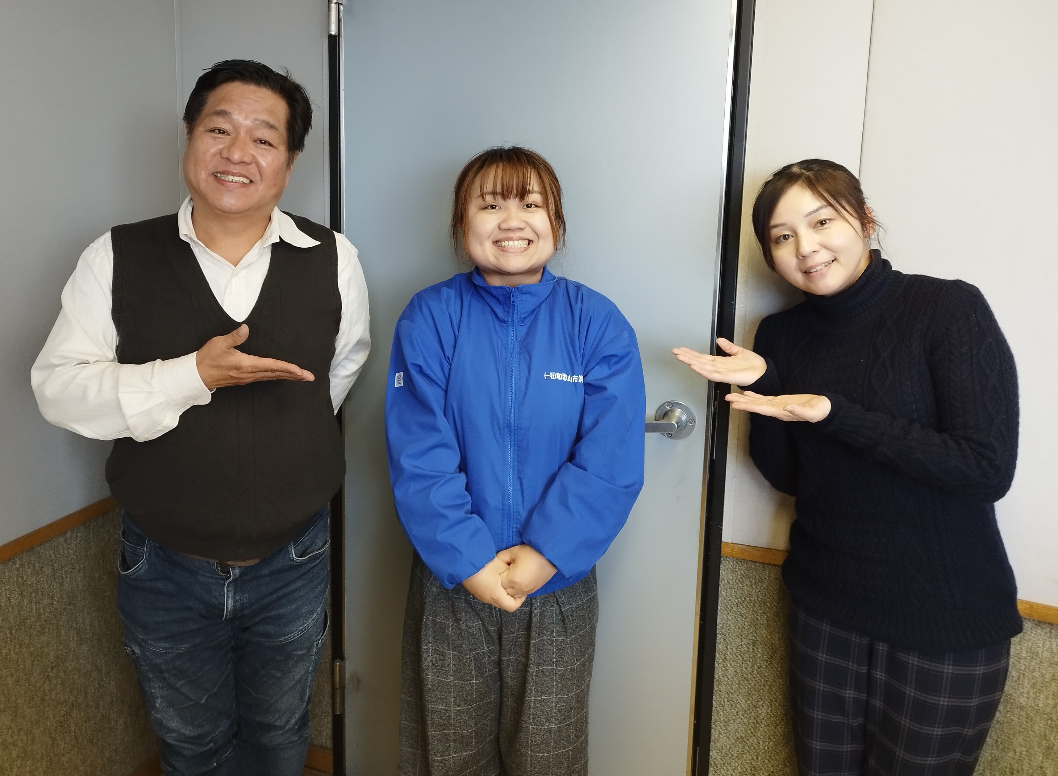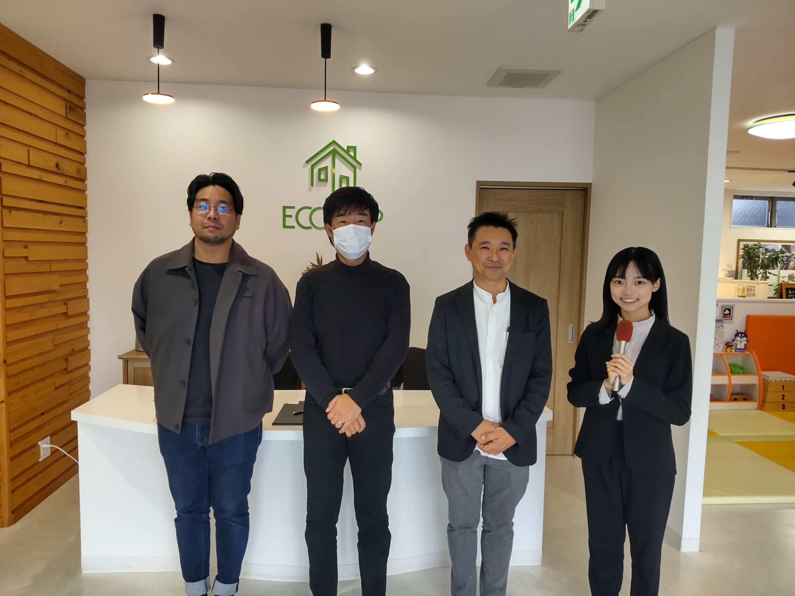 エコ・トップ株式会社の吉田さん、東さん、上田さん に、リポーターの関 陽菜子アナウンサーが、